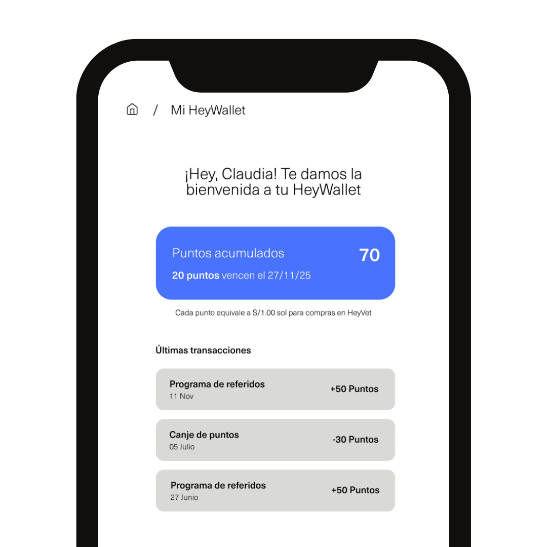 para canjearlos en tus próximas compras en HeyVet. 1 punto equivale a S/1.00.