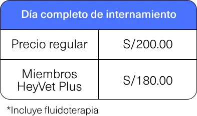 Internamiento Día Completo (incluye fluidoterapia) | S/200.00 | S/180.00 |