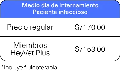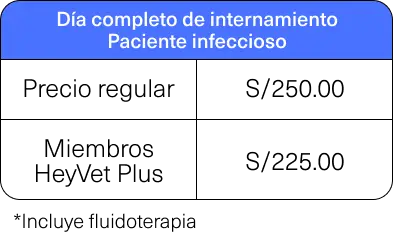 Internamiento Día Completo (incluye fluidoterapia) - Paciente infeccioso | S/250.00 | S/225.00 |