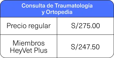 Consulta de Traumatología y Ortopedia | S/275.00 | S/247.50 |